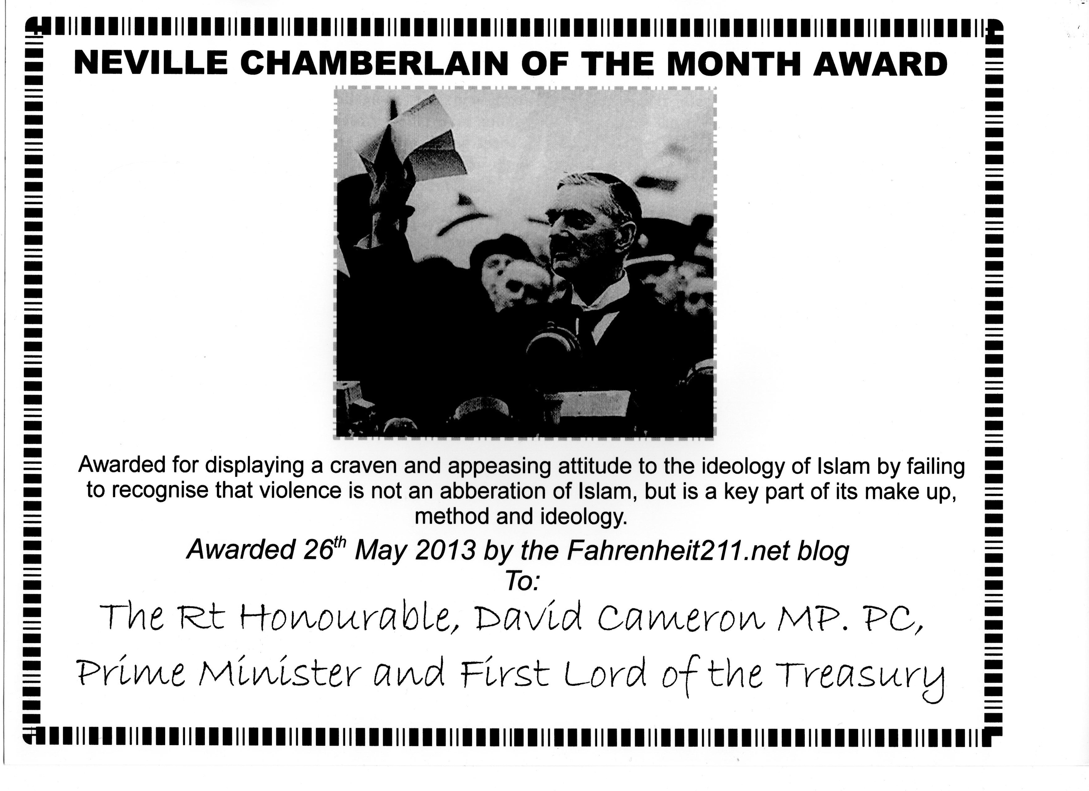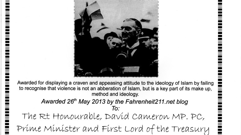 This blog has documented quite a few political and other personages who have shown appeasing attitudes to the ideology of Islam. There have been naïve vicars, senior councillors and Head Teachers, but this special ‘British Neville Award’ can really have only one well-deserved recipient and that is our Prime Minister and First Lord of the Treasury, Mr David Cameron.