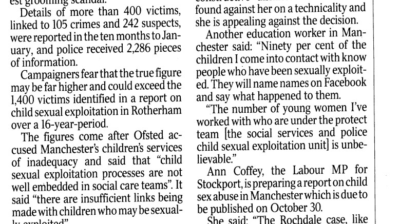 However, many of us have counselled that the problems in Rotherham with Islamic Rape Gangs is not confined to Rotherham, and an article in today’s Times newspaper (scan below) makes that quite clear. The print edition of The Times for 6th October 2014 has stated that there have been ‘hundreds’ of child victims of sexual exploitation in Manchester. I fear that despite the protestations of the Salford Labour MP Ann Coffey, that these crimes may not have been committed ‘solely by Asian men’, we will be seeing the same parade of ‘Mohammeds’ and ‘Abduls’ on the charge sheets as we have seen in Rotherham, Rochdale, Oxford, Bradford and Tyneside.