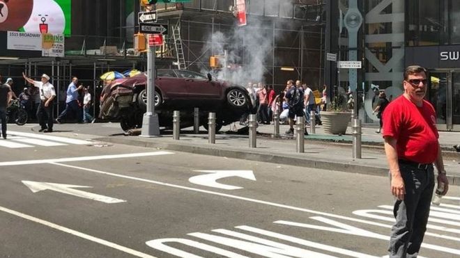 An alleged perpetrator of this atrocity has been arrested by city police and he has been taken away for questioning. Witnesses who spoke to the Reuters News Agency whose offices are nearby to where the attack occurred at 16:00GMT said that the vehicle was travelling against the prevailing traffic and going the wrong way down a one way street. Reuters added that: ‘The car crashed into a pole and came to rest at 45th Street and Broadway.’ The US TV station CBS is being quoted by the BBC as saying that the driver has been arrested for ‘driving whilst impaired’. This suggests that on some level drink or drugs may be involved and that is the main cause of this incident, but the police could equally have also have used this charge merely as an immediate holding charge and more charges and more details may come out later.