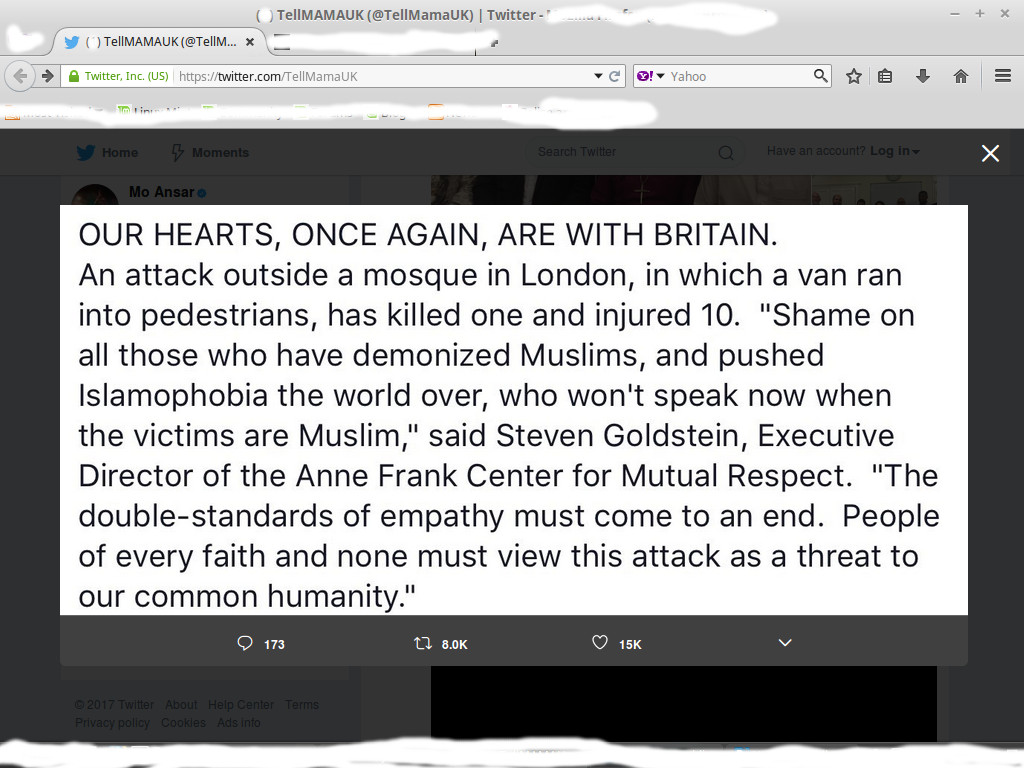 Following the incident near the terror-linked Finsbury Park mosque where, on the 19th June 2017 a crazed man allegedly deliberately drove a hired van into a group of Muslims, the mendacious grievance mongering taqiyya artists of Tell Mama have been milking this crime for all that is worth. For them, having what could be a real anti Muslim attack is manna from heaven, as so often they have had to rely on fake ‘Islamophobia’ cases, such as the Birmingham woman who lied about being verbally assaulted in the street or the testimonies of known mentally ill people claiming that she also had been abused.