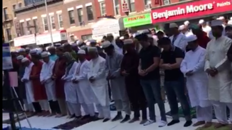 Now it seems that intimdatory preying by Muslims has reached New York City in the United States. According to ‘The Point’ blog, Muslims blocked streets in the borough of Brooklyn, not as part of a protest or similar event, but to push Islam into the faces of New Yorkers, whether they want it or not.