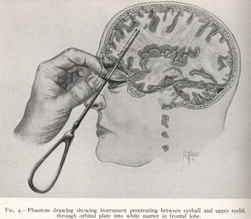 Now for those who do not know, Leucotomies were once as much of a medical fad as gender reassignment surgery is today. Leucotomies were considered as a wonder cure for schizophrenia and depression and thousands of these procedures were carried out in both the United States and Great Britain. At the height of the Leucotomy craze in the late 1940’s and early 1950′s thousands of these procedures were carried out. The operation, to give its most basic description, involved poking a tool into the brain either via the eye sockets or holes drilled in the skull and stirring the brain around a bit. The results of such a treatment were, as we in the modern world can now see, utterly appalling. At worst the patient would die from the severing of a cranial blood vessel or would be reduced to a personality-free incontinent vegetable and at best the patient would be a biddable automaton able to undertake basic housework or menial employment. Those tiny minority of people who were helped by this procedure do not counterbalance the massive number of ruined lives, minds and dead bodies that the promoters and practitioners of Leucotomy left in their wake.