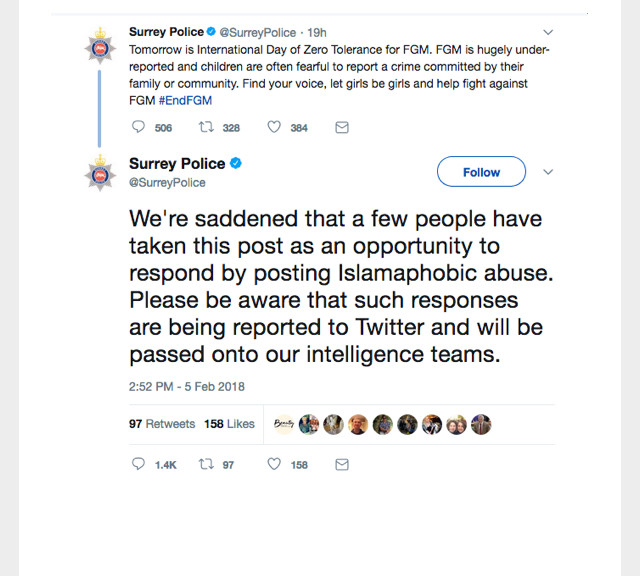 Following on from Surrey worthless and empty virtue signalling over the matter of Zero tolerance for FGM day and the barrage of criticism that both they and the ideology of Islam had got, they put out the following Tweet.