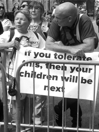 The originals are in colour but when I was looking at them I couldn’t help but think that they would look better in black and white. For me, sometimes I find colour in news images distracting as the eye is drawn to the various colours, especially primary colours, and not to the subject itself. Anyway, this is my personal view of one very small part of what was a truly fantastic show of support for Tommy Robinson and an expression of anger at some of the damage that has been done to our country and our communities.