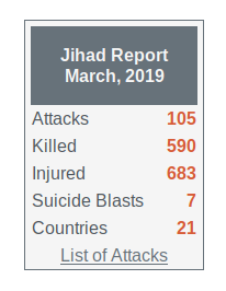 The number of people that have been killed by Muslims in the space of one month dwarfs by a factor of ten the number killed in the appalling Christchurch shooting. However, despite many of the victims of Islamic terrorism being themselves Muslims, there has been no wailing and gnashing of teeth or the rending of garments by virtue signalling Western politicians over these particular dead Muslims. The number of Islam inspired or Islam caused deaths from violence in March is less than