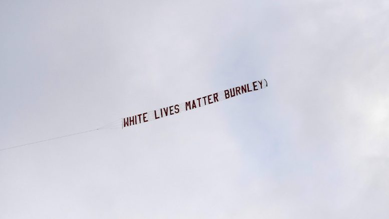 Now we have another example of Woke Cult hypocrisy, this time from the United Kingdom over a banner towed by a small aircraft that read ‘White Lives Matter’ which flew over the Burnley FC stadium at the same time as the team were going through their enforced debasement before the Black Lives Matter movement. The Leftist media in Britain has gone absolutely mental over this banner yet has not criticised a Black Lives Matter movement that is by its very nature, inherently racist.