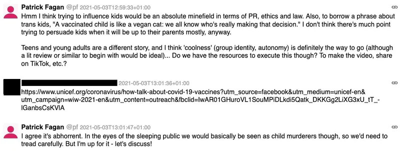 Patrick Fagan, the HART member who formerly worked for Cambridge Analytica was involved in a discussion about pushing anti vaccination messages to the young and especially to teenagers in order to exploit some teenagers need to be seen as ‘cool’ or ‘autonomous’. He said that pushing anti vax messages to children would make them seem like child murderers but that ‘teens and young adults’ are a different story.