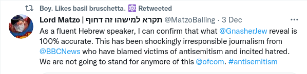 This dishonest reporting by the BBC should be a wake up call for Britain’s Jews about the nature of the BBC, just as other incidents of piss poor or completely bent reporting by the BBC, such as during the Brexit debate and process, has been a wake up call for the general population. Dissatisfaction with the BBC and having its dishonesty and bias revealed has been a major factor in my view of the rise of the De-fund The BBC movement. Maybe, after this incident where the BBC has engaged in blatant dishonesty over an incident of Jew hate, Britain’s Jews should consider joining that movement to de-fund this inherently bent organisation and make it subject to the necessary correction of market forces.