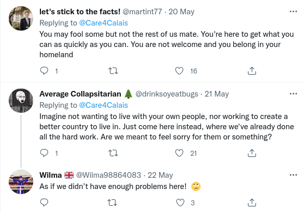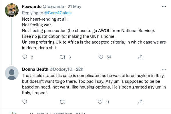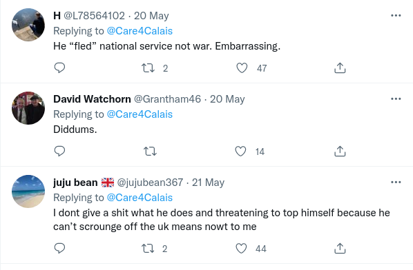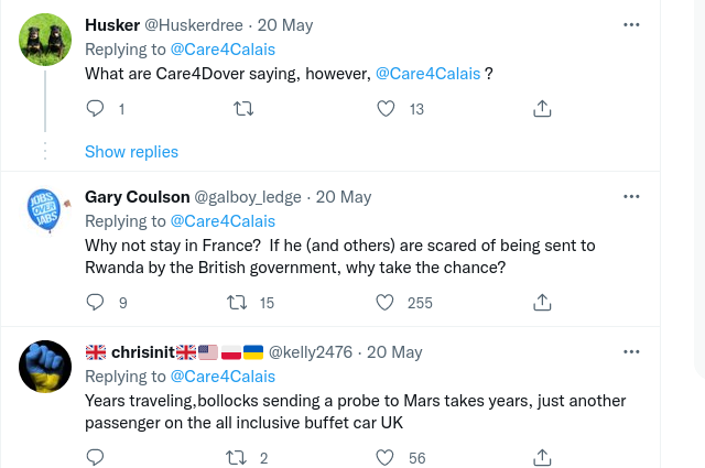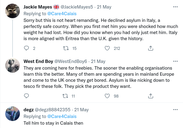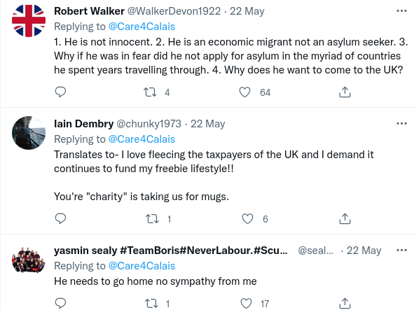 And here are just some of the responses from the public who plainly do not hold the same views about the Channel crossing invaders as Care4Calais do. Talk about being soundly ratioed. There were very few comments that I saw at the time of writing that supported either Care4Calais or their chosen ‘refugee’.