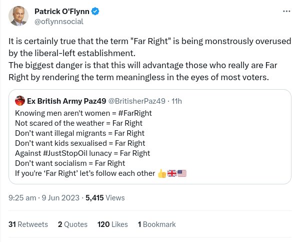 Patrick O’Flynn commenting on social media and quoting from a post by Ex Army Paz49 has made a very good point about the misuse and overuse of the term far right. Mr O’Flynn said: