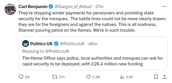 Of course Mosques and innocent Muslims should not be attacked or harmed, but is public Islam-fellatio of the sort that Starmer is clearly engaged in is an effective way to stop such terrible things from happening? I don’t think that it is. The conjunction between the removal of Winter Fuel Payments and splashing taxpayers cash on mosque security is going to do nothing to convince the public that Sir Keir Starmer is going to govern for all Britons and not just some Britons.