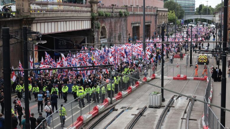 But a Rubicon was crossed this last weekend. Britain First managed to get what looked to me like about two thousand Britons out on the streets in Manchester. This wasn’t their usual three men and a dog demo or one of their swanning around like a bunch of Walts in ex Military Land Rovers in Aldgate events, this was big, this was very very well supported. From the video that I saw of Britain First’s Manchester demonstration it looked like there were at least more than a thousand people there if not double that. The whole road was full of demonstrators nearly all of then with Union or England flags. It wasn’t as big as one of Mr Robinson’s demonstrations but it was very big and certainly bigger than I’ve seen Britain First demonstrations before.