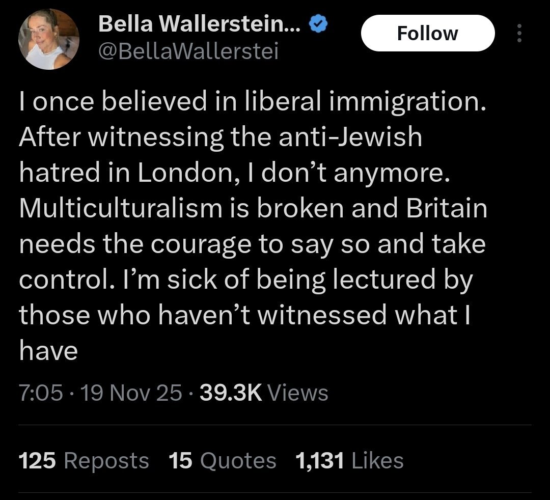 Ms Wallersteiner is getting an awful lot of shit online for her change of heart. People are asking her why she is only coming out as an opponent of multiculturalism because of Jew hatred and not because of the massive amounts of Islamic terrorism, the rape gangs, the anti indigenous hatred of Britain’s ruling classes and much more. Those critics do I’m afraid have a point. However in Ms Wallersteiner’s favour I have to say that what makes an individual reject idiotic and failing ideologies such as multiculturalism or far leftism or extreme environmentalism differs from person to person. I rejected the revolutionary far left as I could not see how they could feed or clothe or support the population or run the economy effectively had these leftist’s revolutionary fantasies become reality. I could see that the revolutionary left was a dangerous dead end. I rejected extreme environmentalism after seeing small haulage companies, some of whom were customers and suppliers of my family’s businesses destroyed by green rules, with the work they did picked up by major global conglomerates who could accommodate such draconian environmental rules. I rejected multiculturalism when I saw it was not bringing people together but instead creating siloisation of people and groups and creating hostile ghettos.